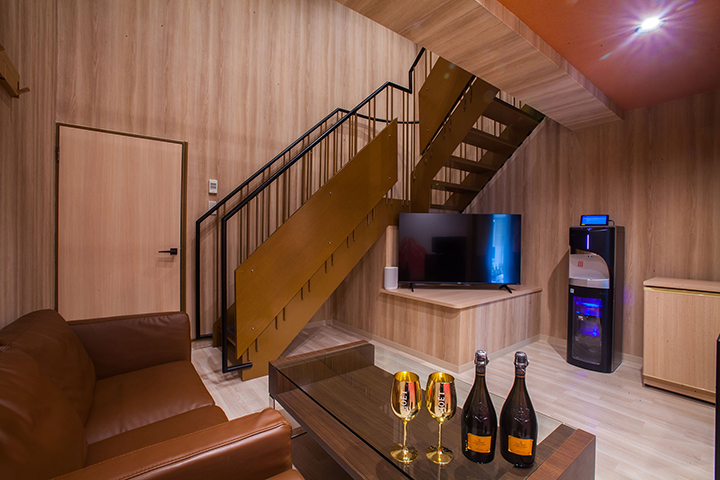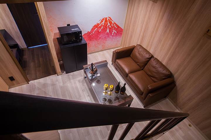 322と301〜307は全てメゾネットタイプ。室内階段の先にベッドルームがあり、隠れ家感と期待感を演出する。照明は暖色を基調に、家具は木目中心のデザインで統一。長時間滞在しても心地よく過ごせるよう、客室内の設備と仕掛けを徹底的に充実させている。