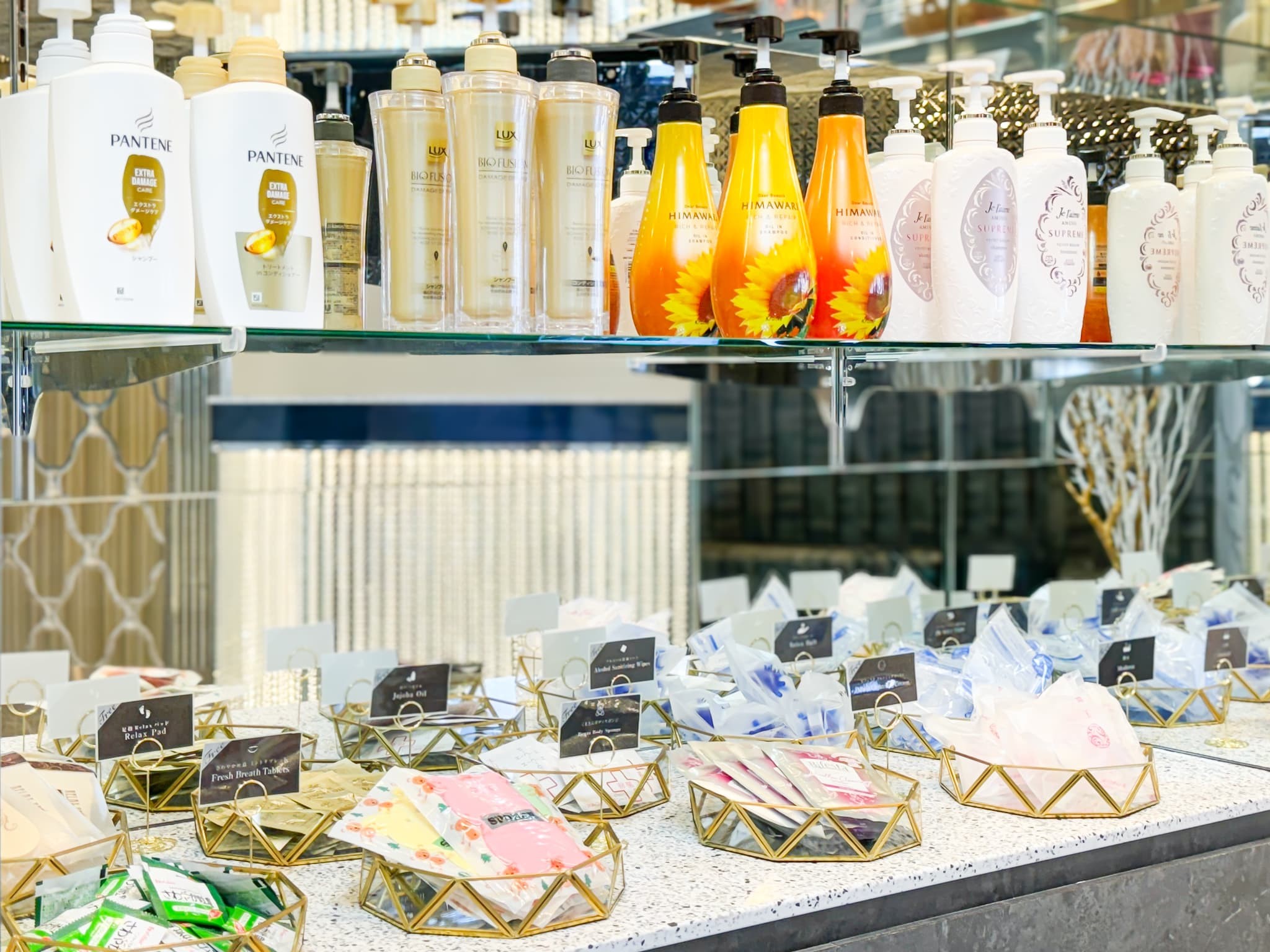 ・ロビーにはワイン飲み放題や女性目線で選んだシャンプー・入浴剤などのバイキングを用意しております。